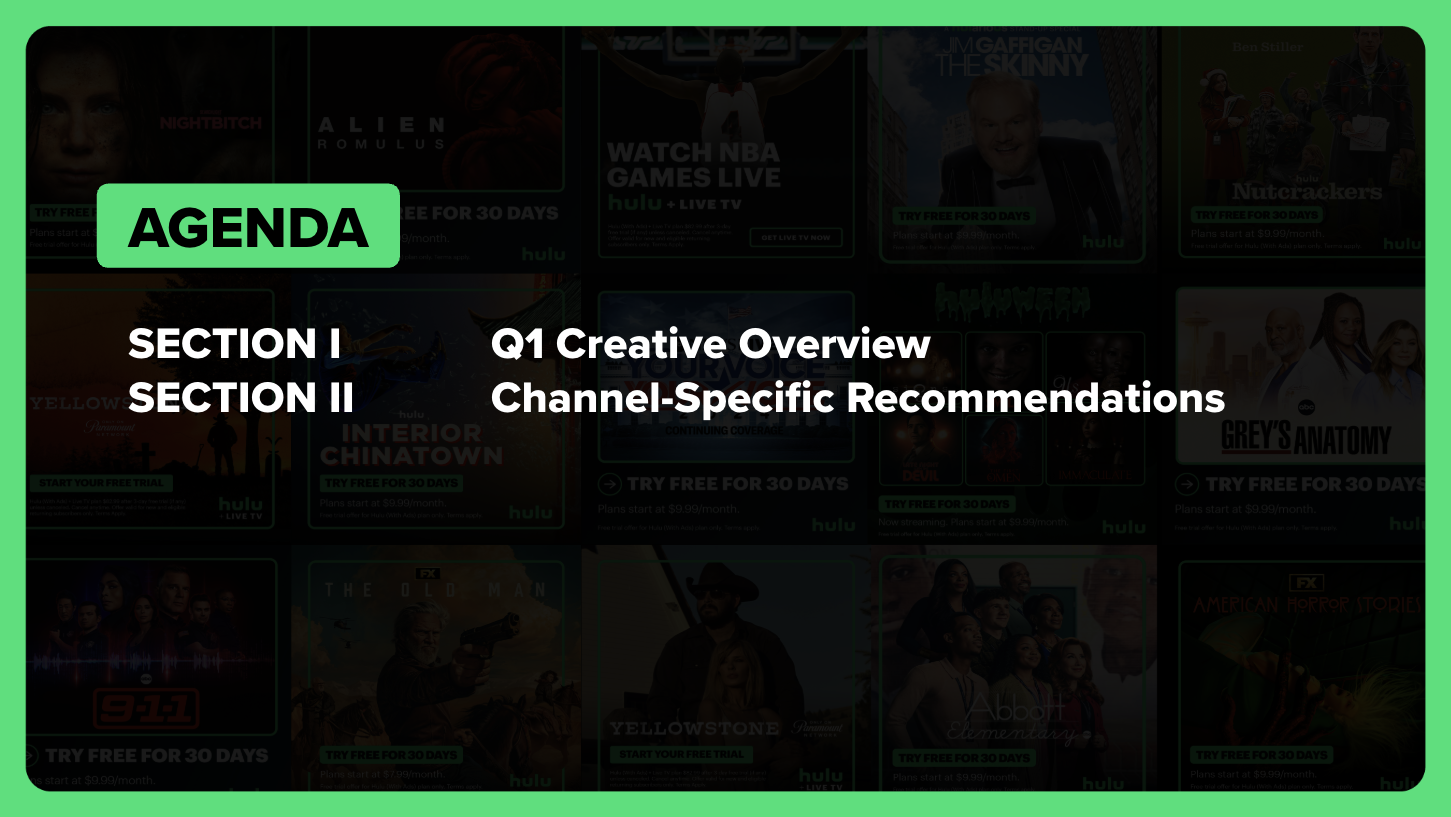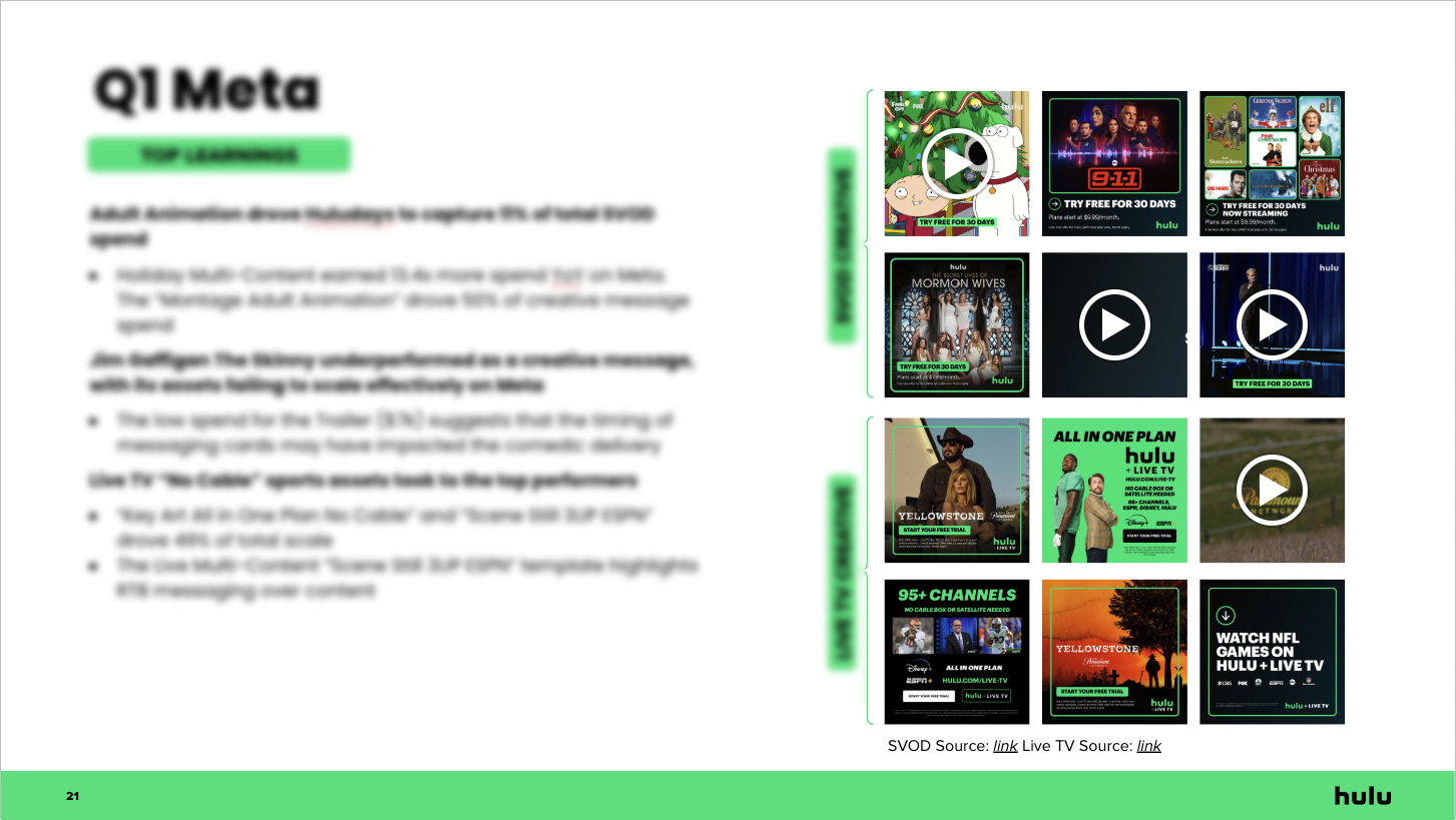 For internal purposes occasionally, I worked with the brand team to Hulu-fy the decks they prepare for clients. I used primarily agency deck structures but added in colors and elements relevant to Hulu.