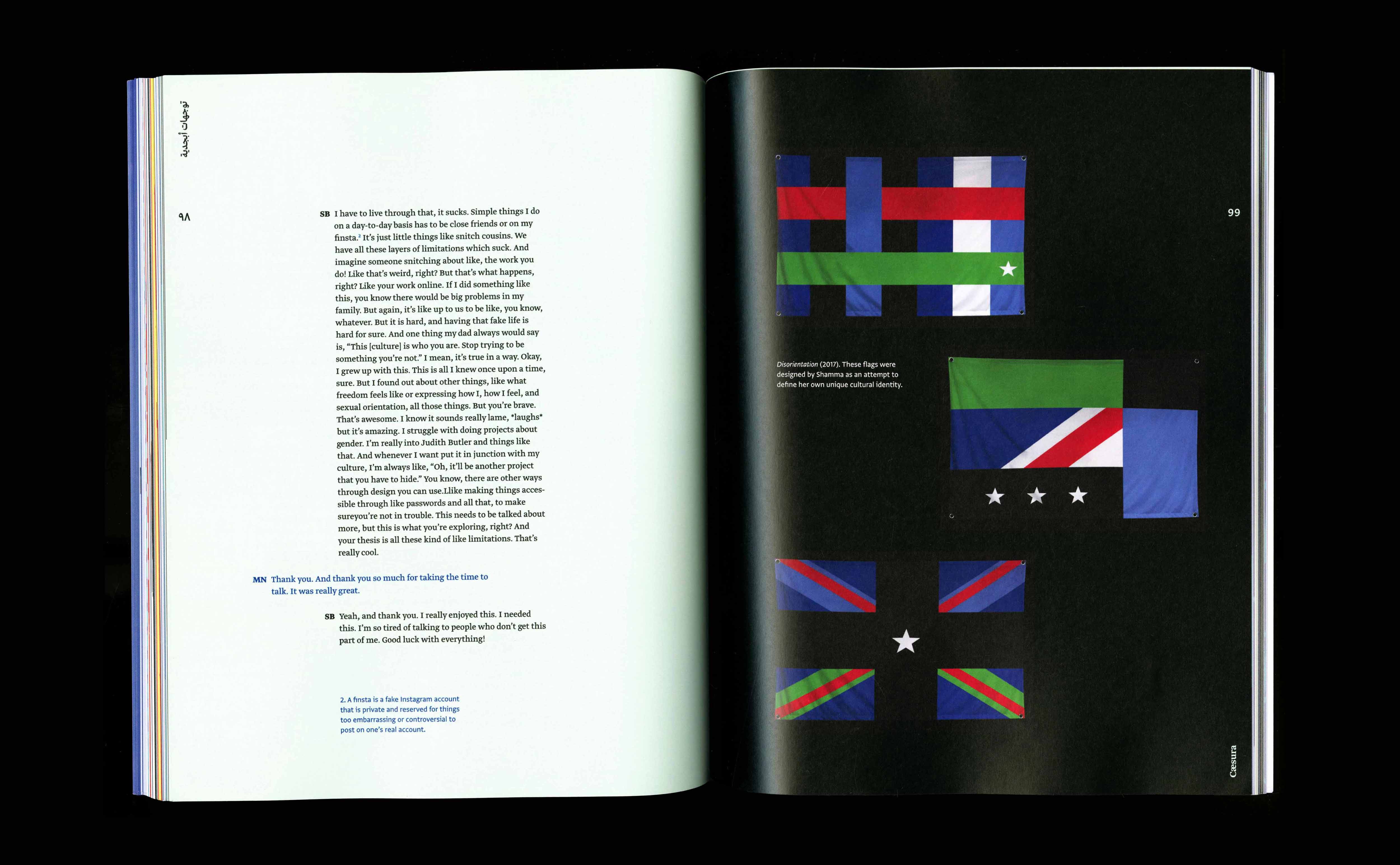 My existing as a queer, multilingual Arab living in diaspora drives the form and content of various design inquiries showcased throughout the thesis process. The book itself also takes structural inspiration from multilingual aspects and translates them into formal design elements.