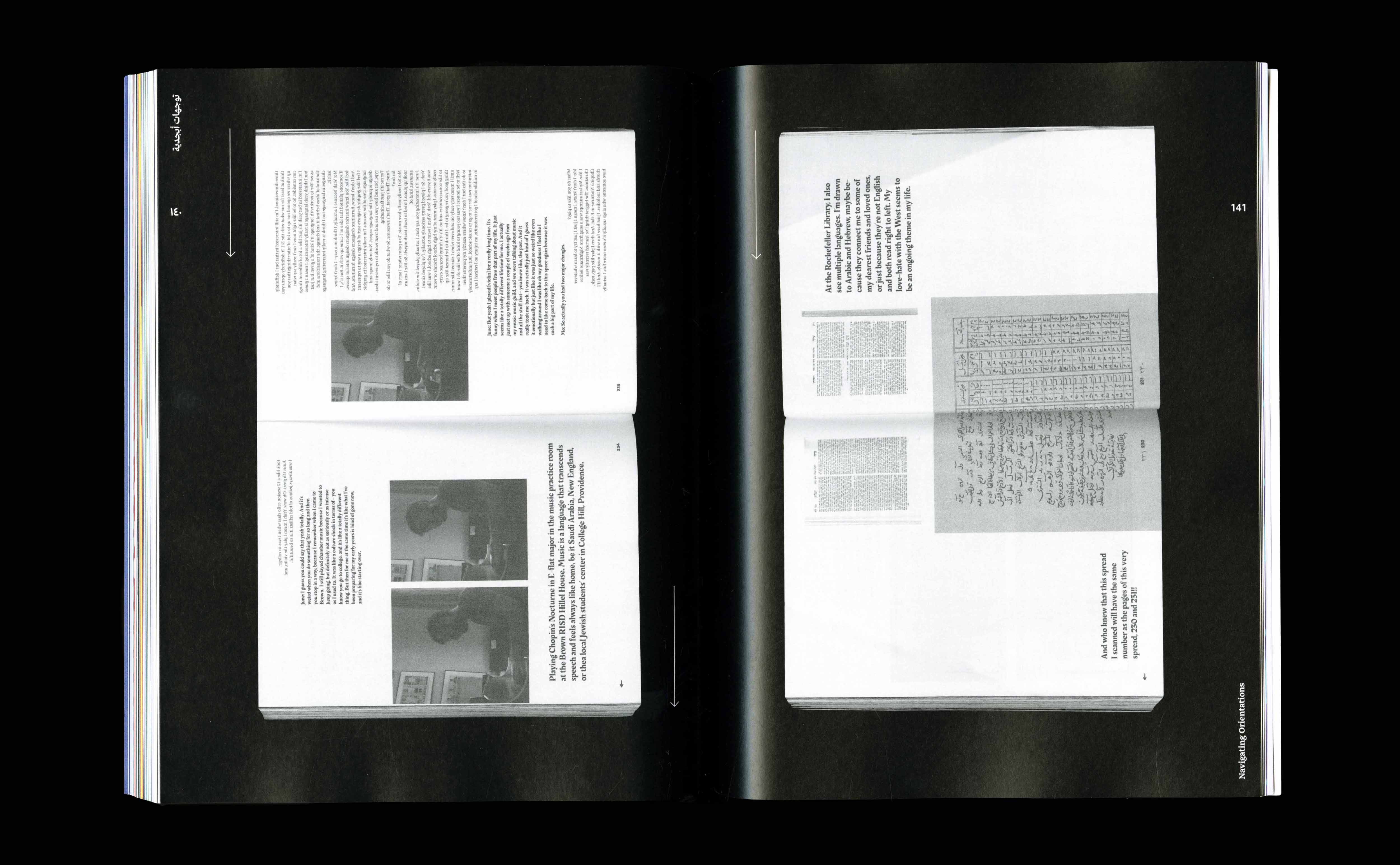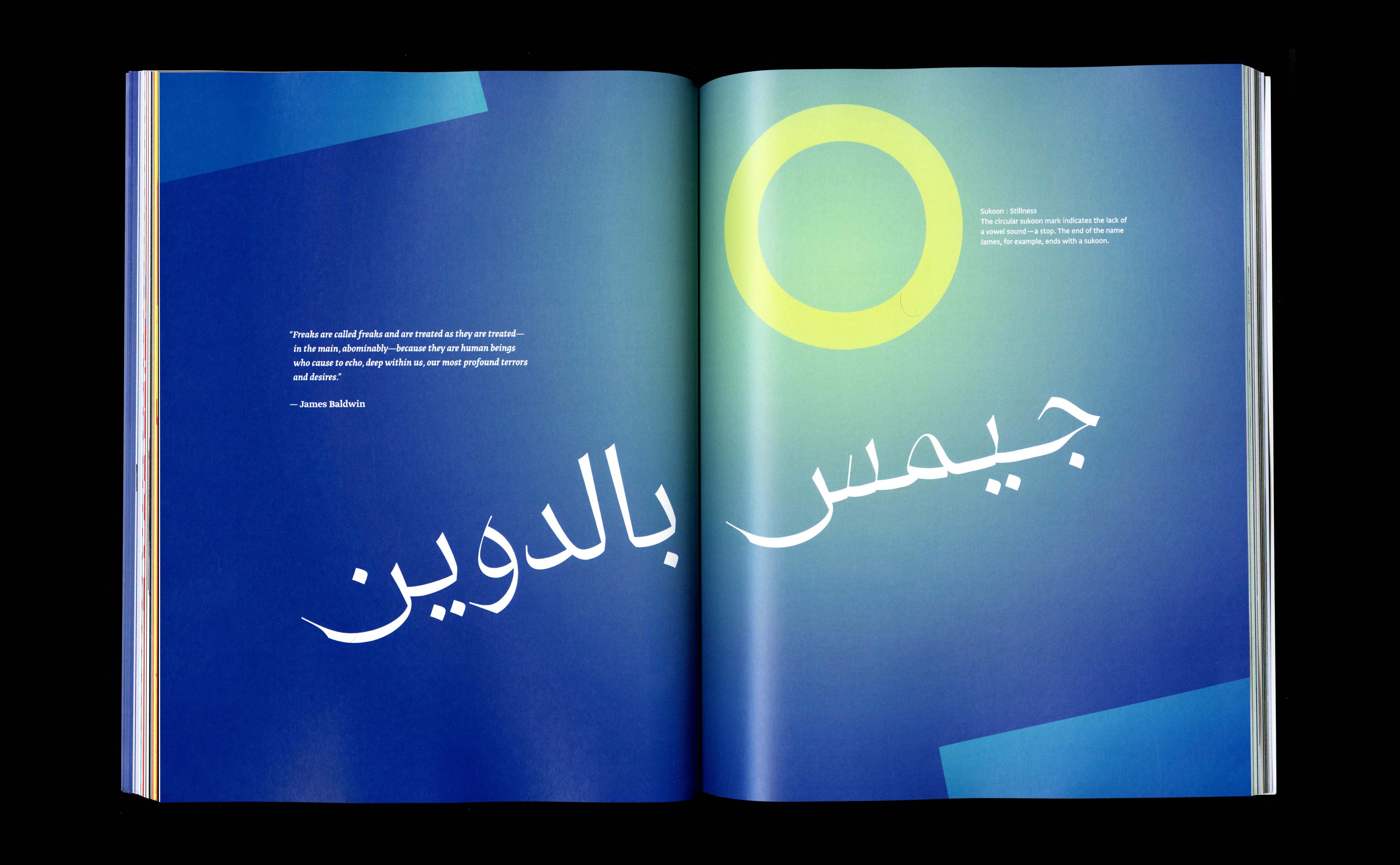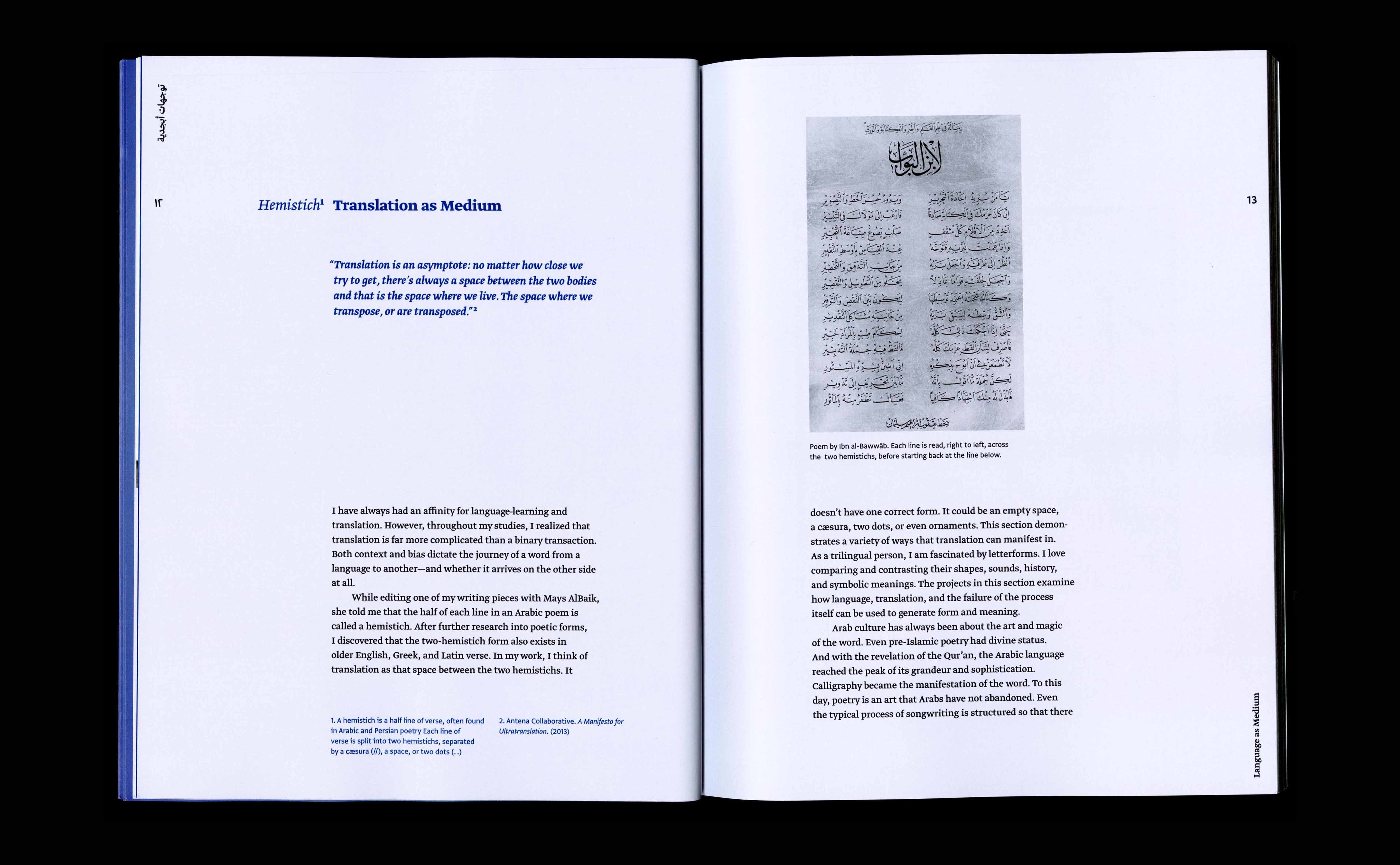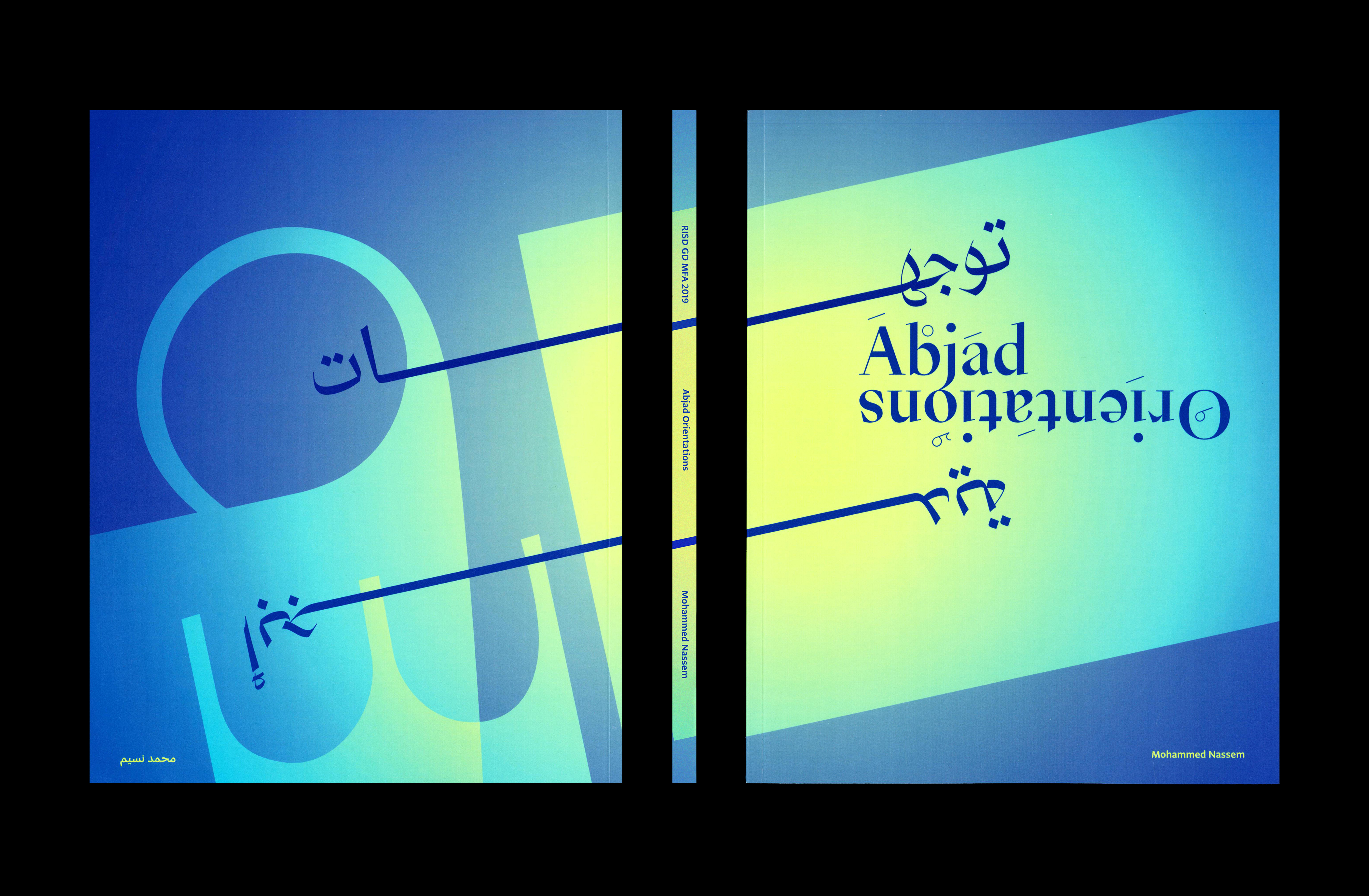 Written and designed at RISD, this MFA thesis investigates verbal and visual language through a lens of translation, queerness, and diaspora. Looking at graphic design as a reconciliatory space, I make use of formal and typographic systems as devices to tell stories, examine cultures, and negotiate conflicting principles. Abjad Orientations is a process of shifting the viewpoint to reorient myself/audience and allow for a closer probe of cultural reality.