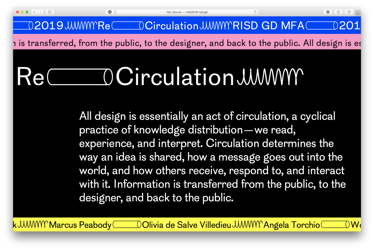 Re-Circulation was designed collectively by the RISD MFA class of 2019: Amy Auman, Chistopher Cote, Joel Kern, Eury Kim, Jieun Kim, Elaine Lopez, Robert McConnell, Mohammed Nassem, Annaka Olsen, Goeun Park, Marcus Peabody, Angela Torchio, Wei-Hao Wang, June Yoon, and Nathan Young