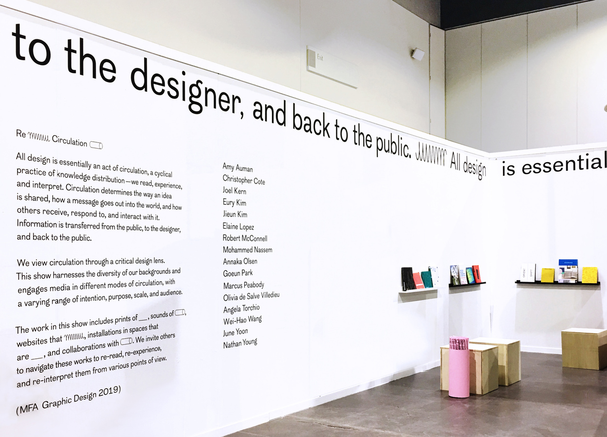 Exhibition of the class of 2019 MFA Graphic Design candidates. This show harnesses the diversity of our backgrounds and engages media in different modes of circulation, with a varying range of intention, purpose, scale, and audience.